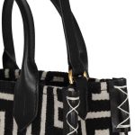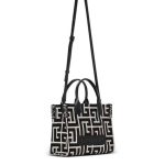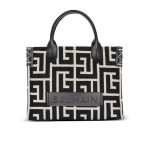 Balmain engraved lobster clasp at the top of the bag , Patch pocket and embossed logo on the inside , Leather bag feet , Tote bag shape , Leather handles and adjustable shoulder strap , Leather inserts and embroidered Balmain Paris logo