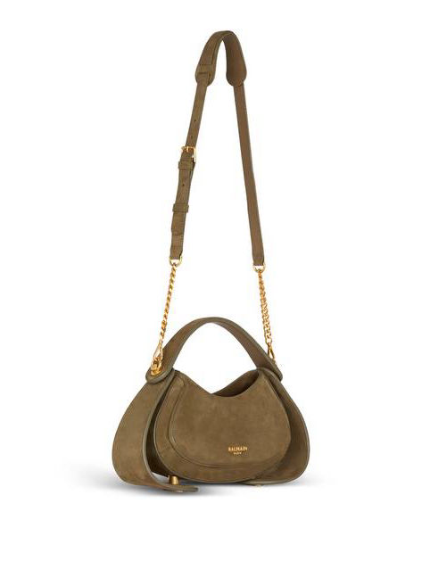Magnetic fastening and leather tab, Engraved metal bag feet Inside patch pocket , Inside leather card pocket, embossed , Balmain logo , Leather lining, Main material: 100% goatskin , Leather and chain shoulder strap, adjustable and detachable with snap hooks