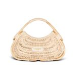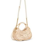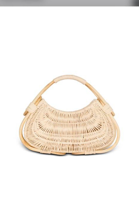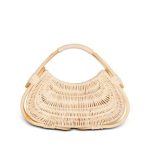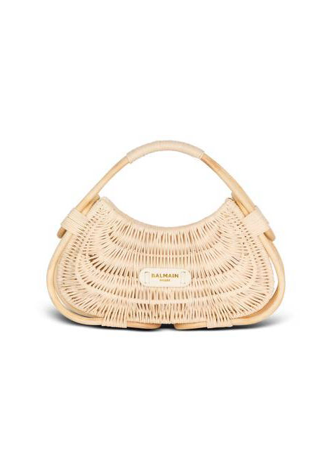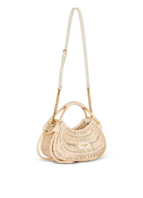 Leather and chain shoulder strap, adjustable and detachable with snap hooks, Leather side tabs with metal rings , Gold hardware Main material: 100% wood, Wicker handles, Curved side pieces