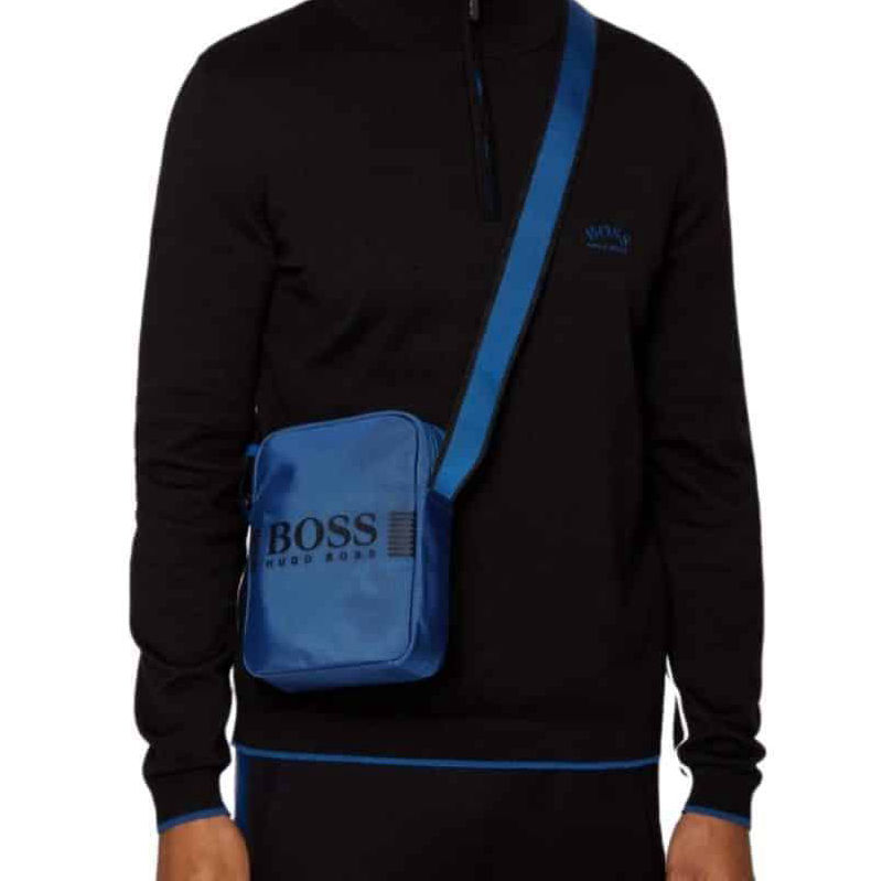 Blue messenger bag by BOSS Menswear  Built to last in hardwearing nylon with waterproof zip Branded zip pull Contrasting print logo on front Adjustable strap