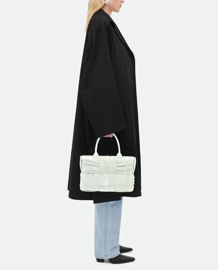 Small foulard Intreccio leather tote bag. Single detachable interior zipped pocket. Leather string closure. Lining: Calfskin bonded Intreccio. Color: Glacier. Hardware: Brass finish