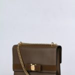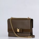 Grey ‘Vara’ shoulder bag from Salvatore Ferragamo. Crafted from calf leather, this item boasts decorative grosgrain bow with a logo-embossed plaque on the front. Its design includes snap fastening, a detachable shoulder strap reinforced with chain, gold-tone metal hardware and interior with one compartment and two slip pockets.