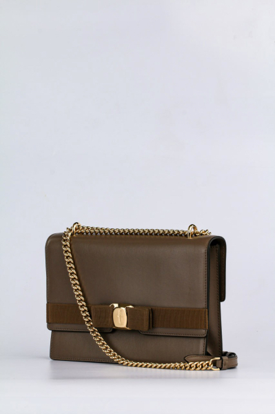 Grey ‘Vara’ shoulder bag from Salvatore Ferragamo. Crafted from calf leather, this item boasts decorative grosgrain bow with a logo-embossed plaque on the front. Its design includes snap fastening, a detachable shoulder strap reinforced with chain, gold-tone metal hardware and interior with one compartment and two slip pockets.