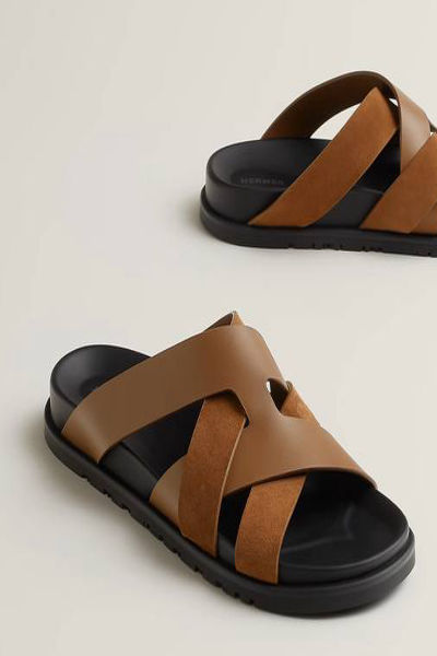 Techno-sandal in calfskin and suede goatskin. An interlaced silhouette inspired by the “H” signature motif, a casual look perfect for summer
