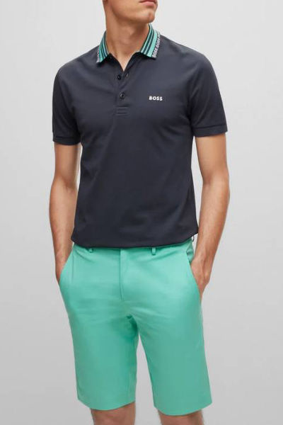 A slim-fit polo shirt in a cotton blend with stripes and branding on the collar by BOSS Menswear. Slim fit Neckline: Flat-knit collar Number of buttons: 3 Short sleeves Flat-knit cuffs Standard length