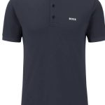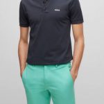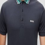 A slim-fit polo shirt in a cotton blend with stripes and branding on the collar by BOSS Menswear. Slim fit Neckline: Flat-knit collar Number of buttons: 3 Short sleeves Flat-knit cuffs Standard length