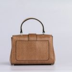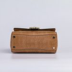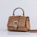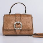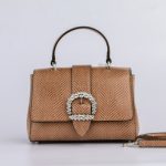 JIMMY CHOO Calfskin Crystal Small Cheri Top Handle Bag in Beige. This chic handbag is crafted of leather in beige and features an optional crossbody strap, silver hardware, and a crystal-embellished front lock. This opens to a partitioned beige fabric interior with a zipper pocket.
