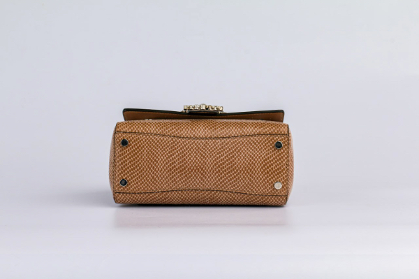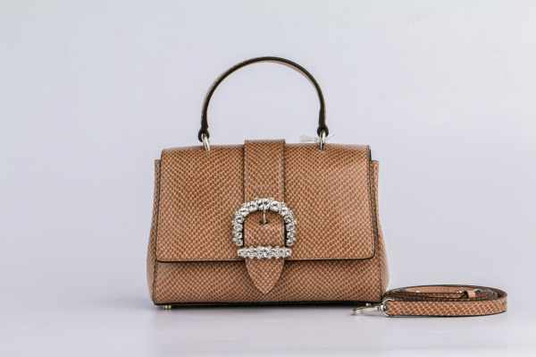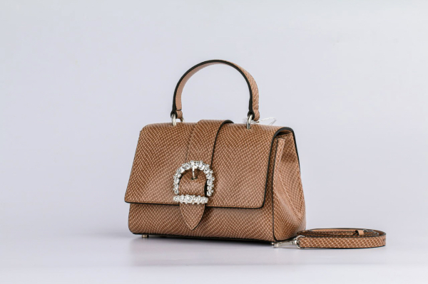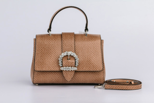 JIMMY CHOO Calfskin Crystal Small Cheri Top Handle Bag in Beige. This chic handbag is crafted of leather in beige and features an optional crossbody strap, silver hardware, and a crystal-embellished front lock. This opens to a partitioned beige fabric interior with a zipper pocket.