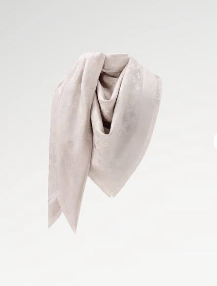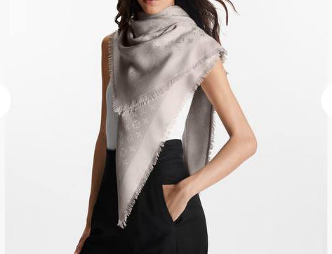 • Greige • 60% silk, 40% wool • Jacquard weave • Monogram pattern • Woven Louis Vuitton signature • Fringe finish • Dry clean only