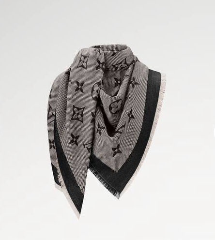 Black 70% wool, 30% silk Jacquard weave Monogram pattern Woven Louis Vuitton signature Fringe finish Dry clean only