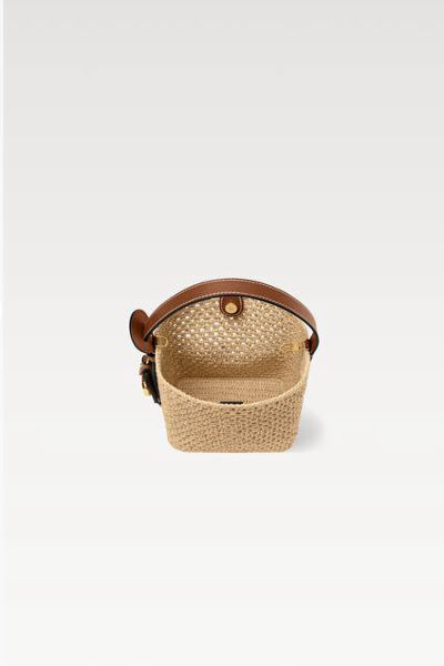Strap: Non-removable, adjustable , Strap Drop: 12.0 cm , Strap Drop Max: 55.0 cm , Handle: Single , Cowhide leather trim, Raffia lining , Gold-colour hardware, Magnet and hook closure, 1 name tag and padlock , Raffia