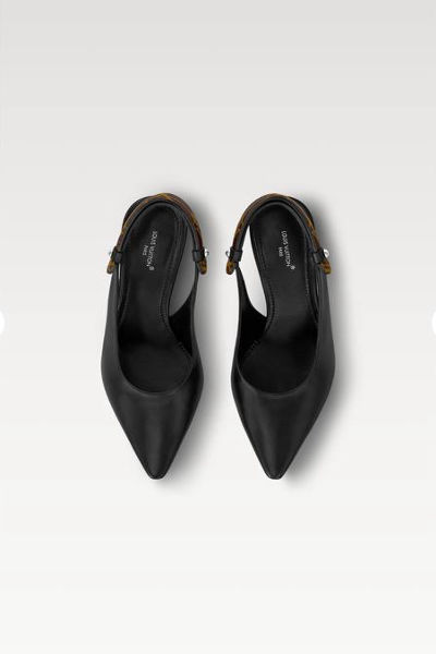 Signature details , Leather outsole , 9 cm/3.5-inch heel , Plain calf leather/Monogram canvas , Elasticised strap