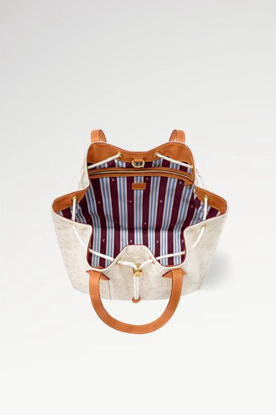 Zipped inside pocket 2 inside flat pockets , Adjustable drawstring closure system , Removable name tag , Handle: Single x2, Monogram Heritage coated canvas , Cowhide leather trim , Textile lining