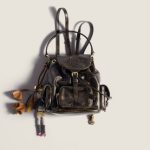 Leather handle,  Front zipper pocket,  Side flap pockets with buckle , Gold-tone hardware