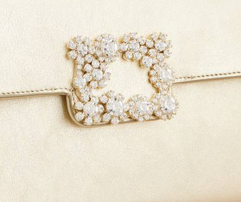 Calfskin leather ,  Metallic finishing , Metal chain , Crystal buckle , Magnetic button closure , Fabric lining ,  Internal pocket