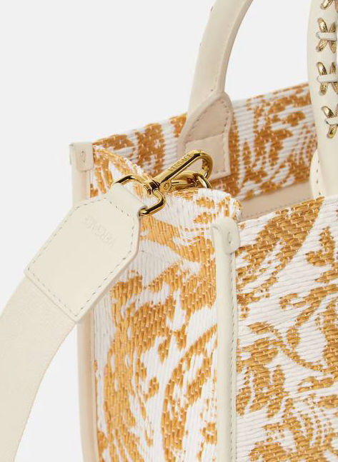 Interior zip pocket , Detachable and adjustable shoulder strap , Leather feet , Barocco pattern ’90s Vintage Logo patch , Top handles