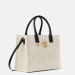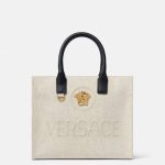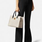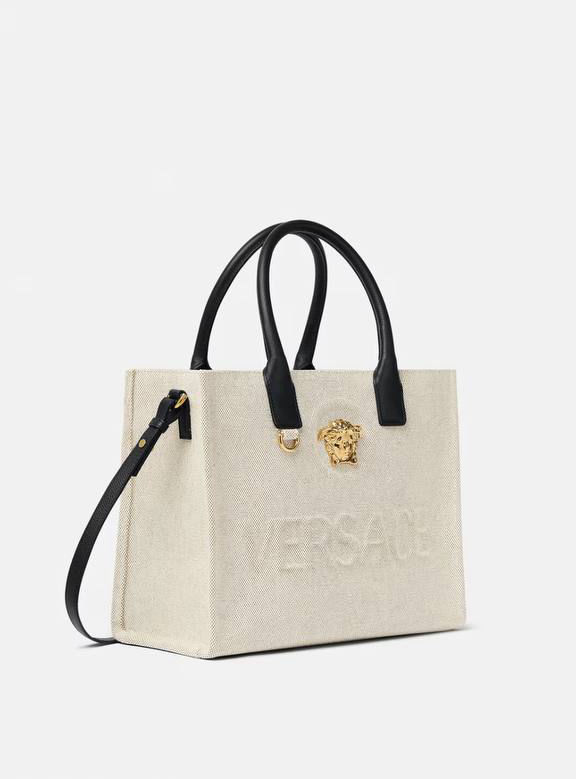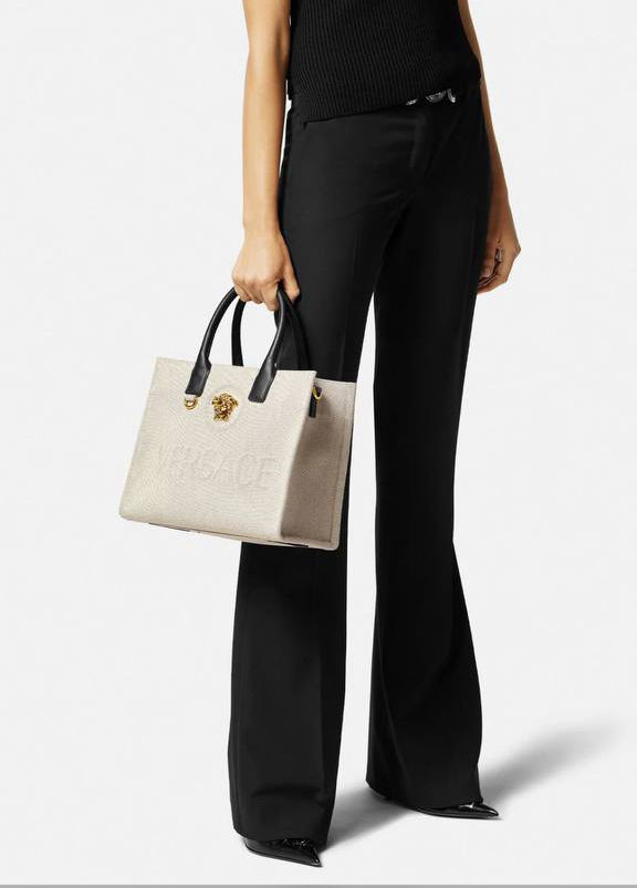 Internal zipped pockets , Detachable and adjustable shoulder strap , Medusa plaque Raised logo lettering , Double top handles with internal protector strap