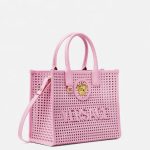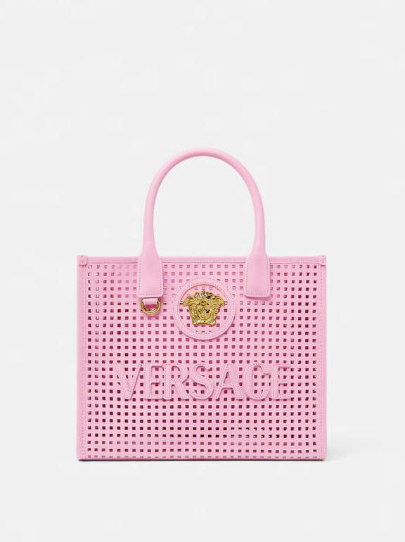 Interior zip pocket , Detachable and adjustable shoulder strap , Leather feet , La Medusa hardware , Versace Logo lettering , Laser cut motif , Double top handles