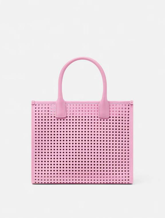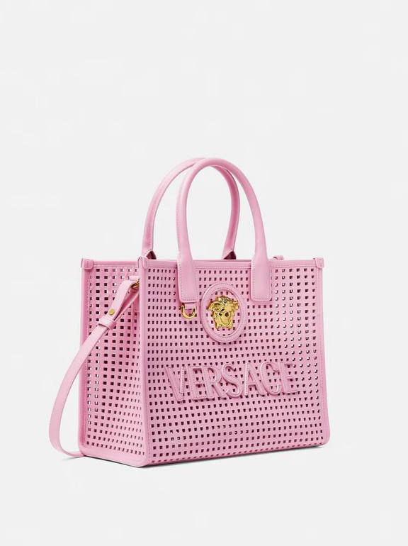 Interior zip pocket , Detachable and adjustable shoulder strap , Leather feet , La Medusa hardware , Versace Logo lettering , Laser cut motif , Double top handles
