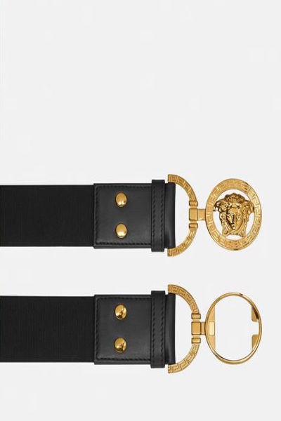 This elastic belt features a clic-clac Medusa and Greca-engraved buckle closure, detailed with leather finishes. Medusa hardware Greca engraving Clic-clac closure Outer composition: 100% calf leather Trim: 100% Nylon