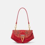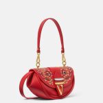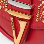 Foldover flap with magnetic closure , Interior slip pocket , Detachable and adjustable shoulder strap , V hardware , Versace Logo engraving , Stud embellishments , Detachable top handle