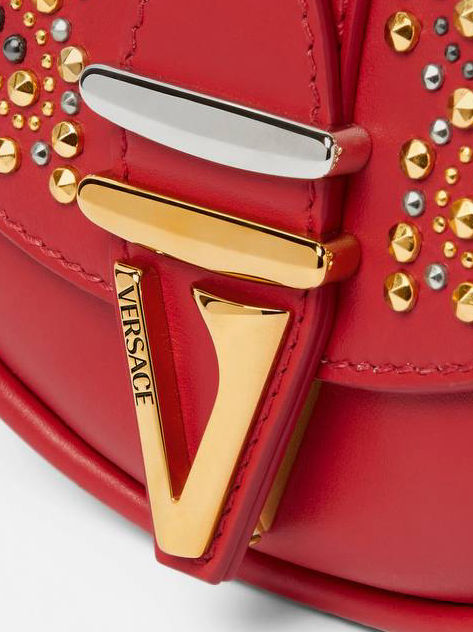 Foldover flap with magnetic closure , Interior slip pocket , Detachable and adjustable shoulder strap , V hardware , Versace Logo engraving , Stud embellishments , Detachable top handle