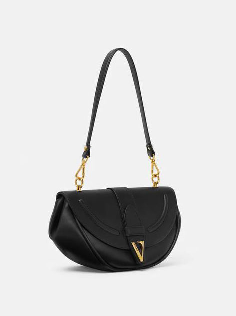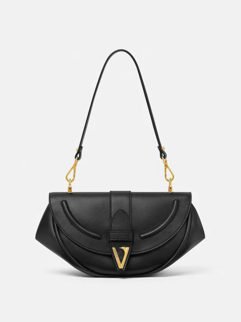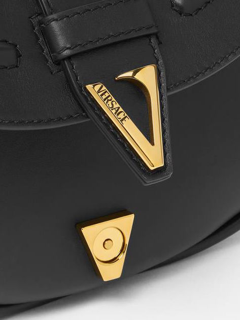 Foldover flap with magnetic closure , Interior slip pocket , V hardware , Versace Logo engraving , Detachable top handle